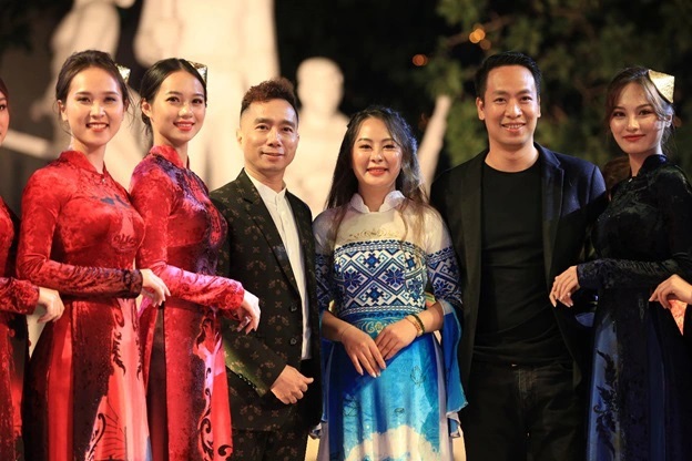 Đạo diễn Quang Tú chụp ảnh kỷ niệm cùng NTK Đỗ Trịnh Hoài Nam, NTK Thảo Giang và các người mẫu trình diễn áo dài